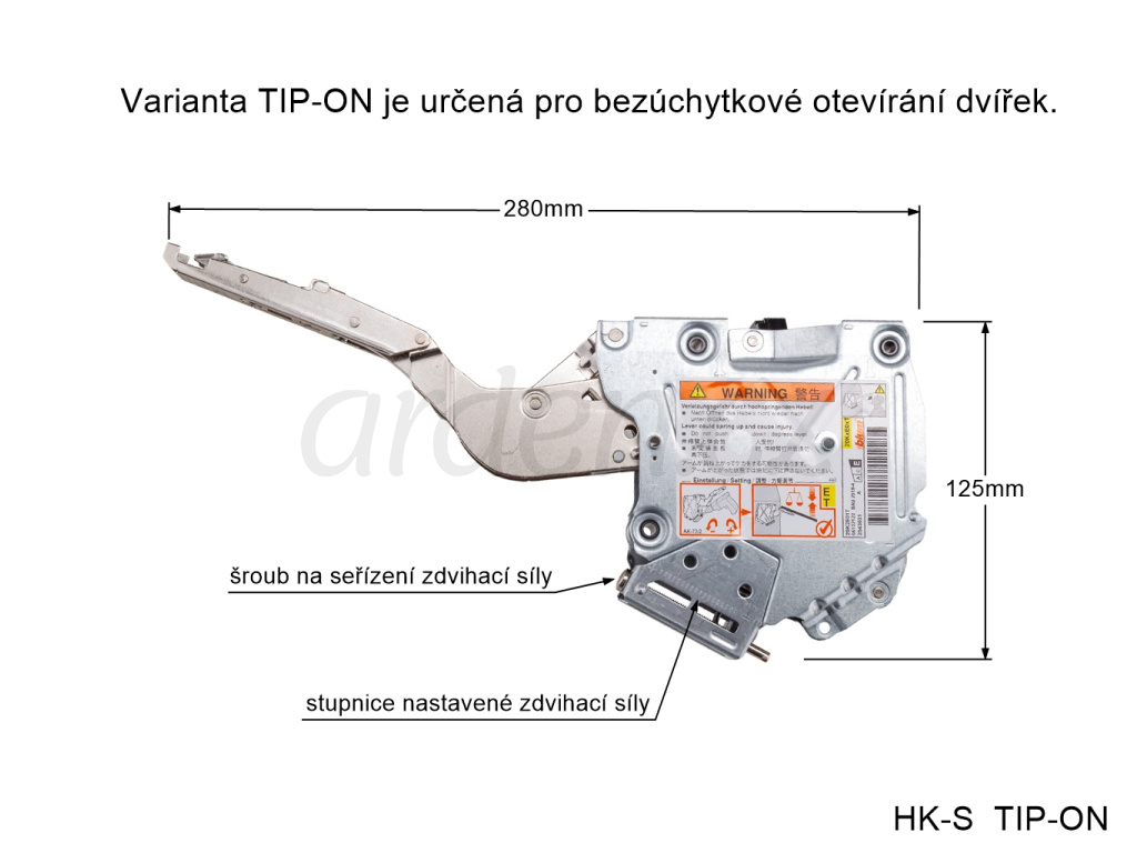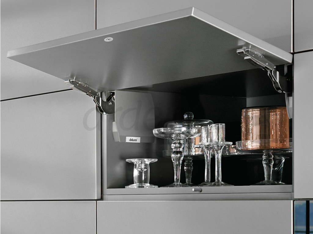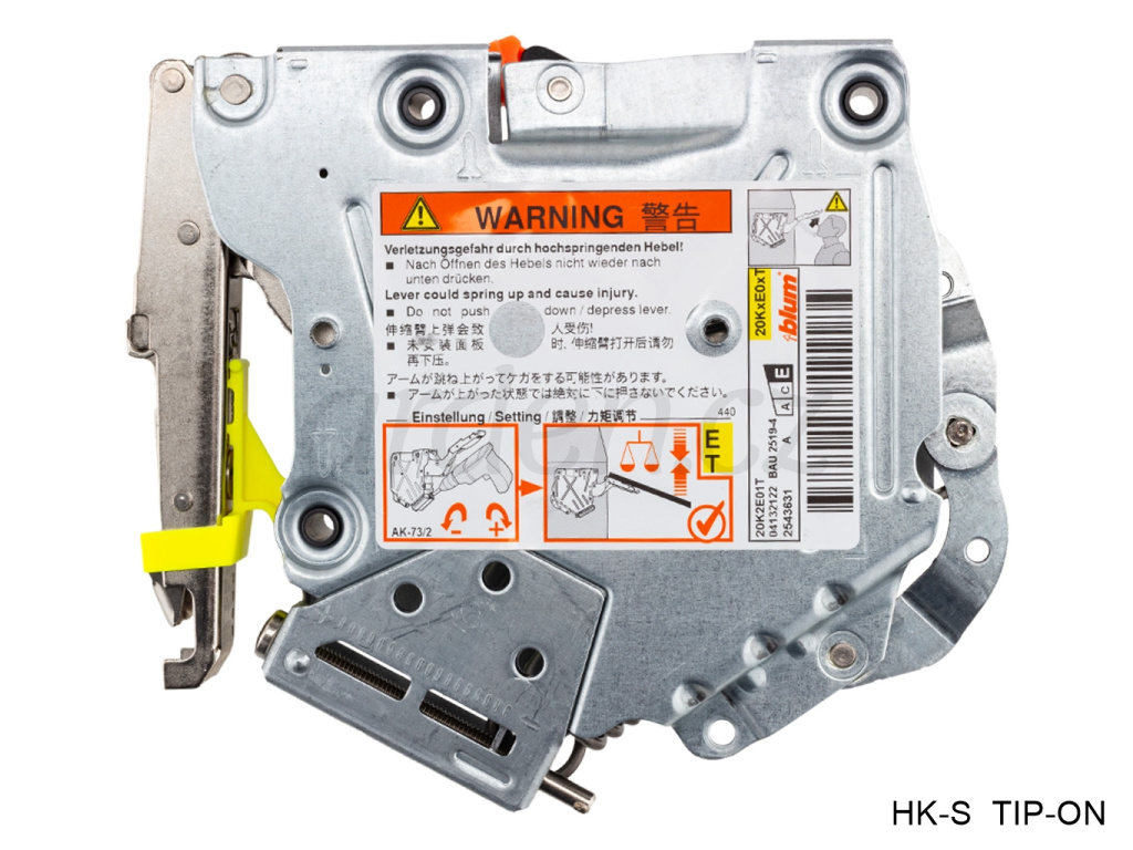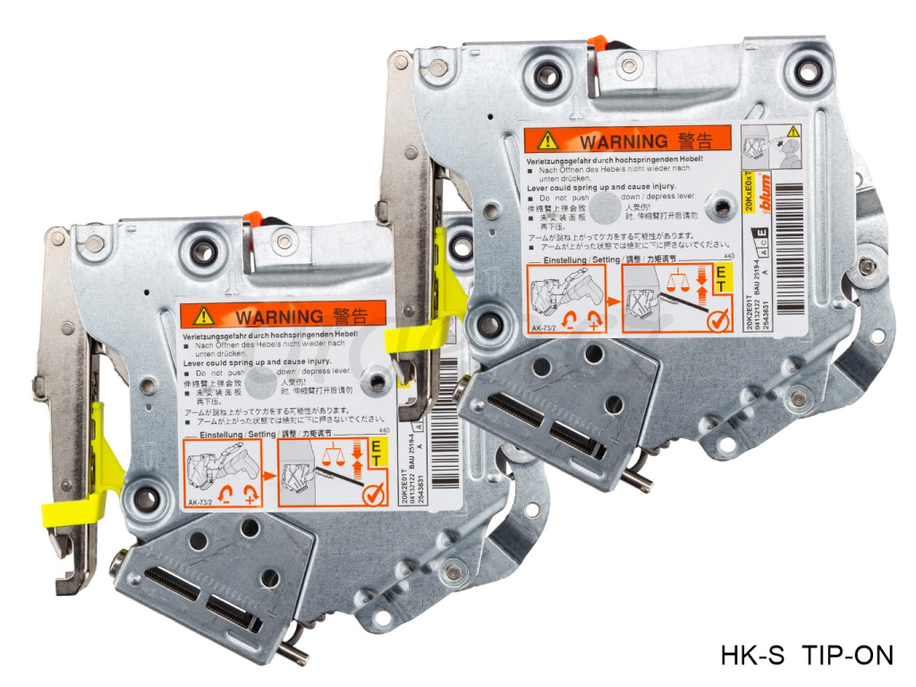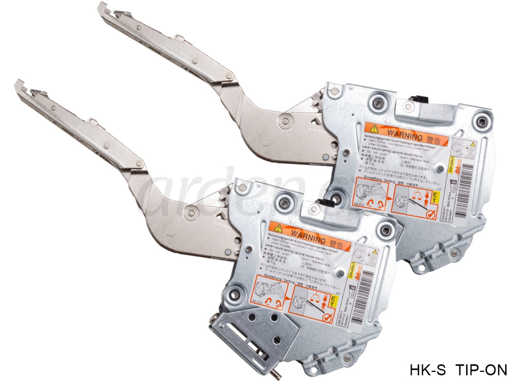 Spolehlivý zdvihací mechanismus Aventos HK-S TIP-ON na bezúchytkové otevírání výklopných nábytkových dvířek od rakouské firmy Blum. S ohledem na spojení dvířek s mechanismem pouze čtyřmi vruty mnohdy v dřevotřískách o různé hustotě, se doporučuje používat tento typ mechanismu pro korpusy o výšce do 400 mm. Pro výšku korpusu 400 až 600mm v závislosti na šířce korpusu a hmotnosti dvířek může být nutný i třetí zdvihač, pro který je potřebná středová přepážka ve skříňce. Šířka korpusu může být do 1800 mm.