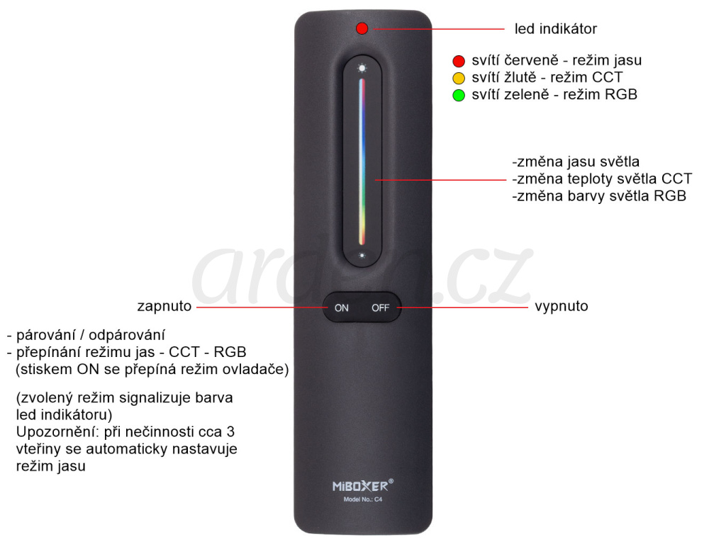 Dosah ovladače k přijímači je do 30m. Ovladačem lze ovládat barevné RGB a dvoubarevné CCT (CTA) led pásky. V základním režimu se pohybem prstu na posuvníku ovládá jas. Po přeměně do režimu RGB se na posuvníku volí barvy, při zvolení režimu CCT se volí barevná teplota CCT led pásku. Po cca 3 vteřinách nečinnosti na posuvníku se režim vrací na ovládání jasu.