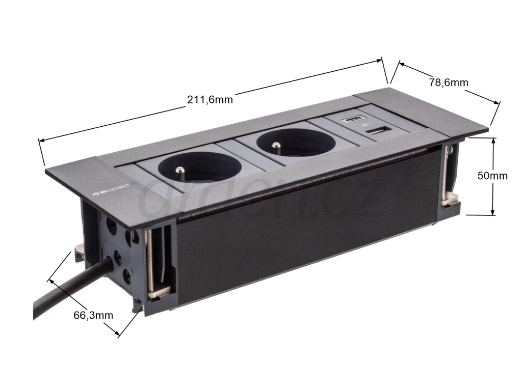 Velmi elegantní elektro zásuvka INTRO je určená pro montáž do stolu, pracovní kuchyňské desky, sádrokartonu apod. Dá se upevnit do materiálu o tloušťce 5-35 mm. Zabudovaná zásuvka vyčnívá nad povrch cca 2,5 mm. Pod zásuvkou je nutno mít montážní prostor min. 50mm.