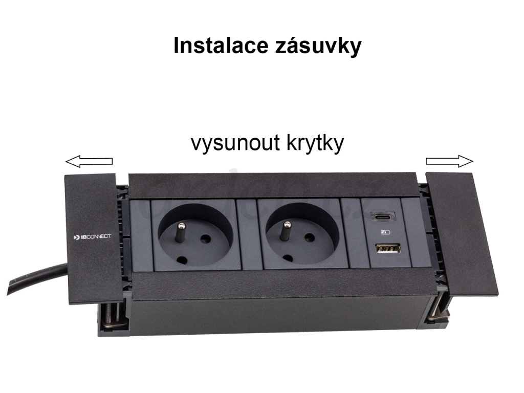 Po vysunutí bočních krytek se zásuvka vsadí do zhotoveného otvoru a pomocí imbusového klíče 2,5mm se přitáhne k podkladu. Při otáčení šroubků imbusovým klíčem se packy vytočí do prostoru a přisunují se k podkladu. Po dosažení podkladu dojde k ukotvení zásuvky. Poté se krytky nasunou zpět.