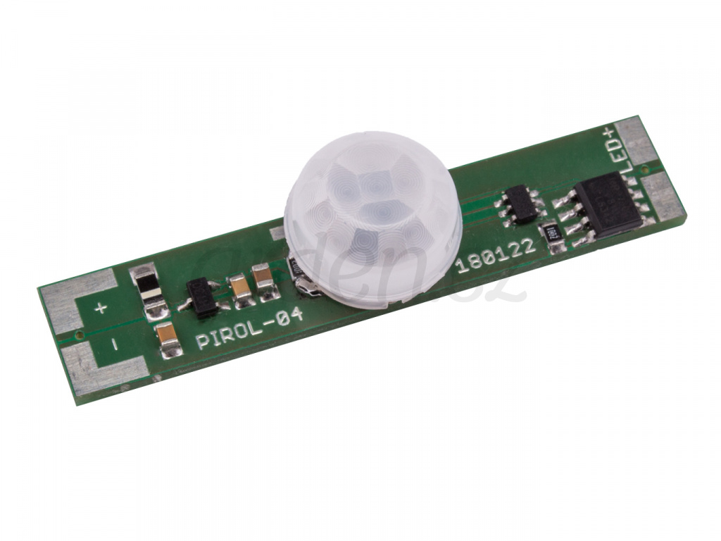 Spínač pro LED pásky s infračerveným detektorem pohybu a pevně nastaveným časem doby svitu 40 sekund. Když se osoba dostane do zorného pole a dosahu čidla, spínač sepne osvětlení. Pokud se osoba pohybuje v průběhu svitu v dosahu PIR čidla, je čas svícení neustále obnovován. Po opuštění detekčního pole čidla bude světlo svítit ještě 40 sekund a poté zhasne.