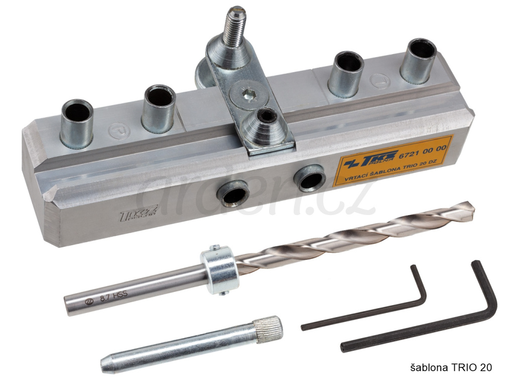 Vrtací šablona pro čtyřbodové závěsy TRIO 20 od české firmy TKZ se použije pro vrtání otvorů pro levé i pravé křídla vrat. Pro správnou pozici šablony slouží stavitelná opěrná podložka.